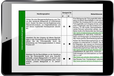 Auf perwiss.de finden Sie gegenwärtig verschiedene Werkzeuge, die Ihnen bei der Gestaltung des demografischen Wandels in Ihrem Unternehmen helfen. Dazu gehören: