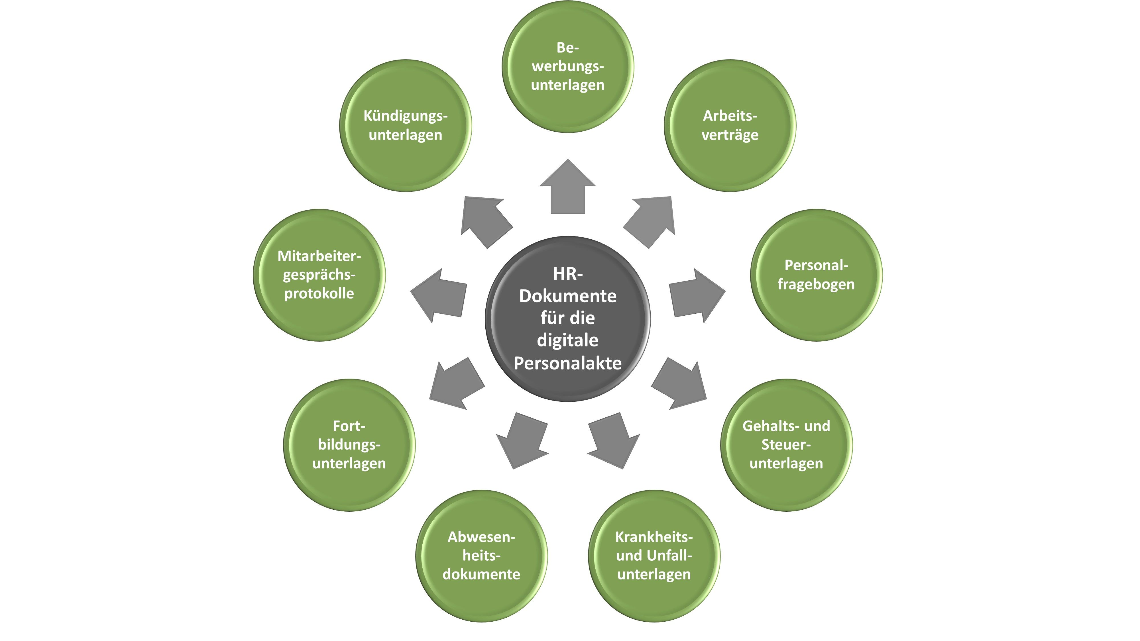 Zu einer digitalen Personalakte zählen beispielsweise Unterlagen einer Bewerbung wie Zeugnisse, Lebensläufe, Leistungsbeurteilungen oder Arbeitsverträge. Auch Dokumente wie Abmahnungen, Kündigungen oder eine Arbeits- und Aufenthaltserlaubnis sowie ein Führungszeugnis können in der digitalen Personalakte abgelegt werden.