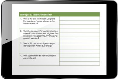 Der Leitfaden "Paperless-Office" von Sven Kunzmann (2013) führt Unternehmen in einfachen Schritten zur digitalen Personalakte. Dabei geht der Autor sowohl auf rechtliche Fragen, die während der Zeit der Implementierung auf Unternehmen zukommen könnten, und auf Problemlösungsansätze ein. Somit kann eine individuelle, eigenständige Einführung gewährleistet werden, selbst wenn keine technischen Vorkenntnisse vorhanden sind. Der Umgang mit personenbezogenen Daten steht dabei im Mittelpunkt. Dieser Leitfaden gibt dabei eine gute Orientierungshilfe und praktische Informationen.