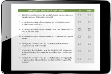 Achten Sie darauf, dass der Mediator über eine enstprechende Ausbildung gemäß der Verordnung des Mediationsgesetzes hat.