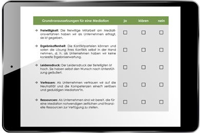 Die freiwillige Teilnahme der Konfliktparteien am Verfahren ist absolute Grundvoraussetzung für eine Mediation. Darunter ist zu verstehen, dass beide Seiten daran interessiert sind, zu einer Lösung zu kommen. Die Beteiligten müssen die Bereitschaft haben, sich zu öffnen und über ihre Sichtweise auf die konflikthafte Situation zu sprechen. Auch wenn das Interesse an einer Konfliktlösung besteht, kann es jedoch notwendig sein, dass die Unternehmen (Führungskräfte oder Vorgesetzte) ihre Mitarbeiterinnen und Mitarbeiter erst dazu motivieren müssen, sich auf eine Mediation einzulassen.