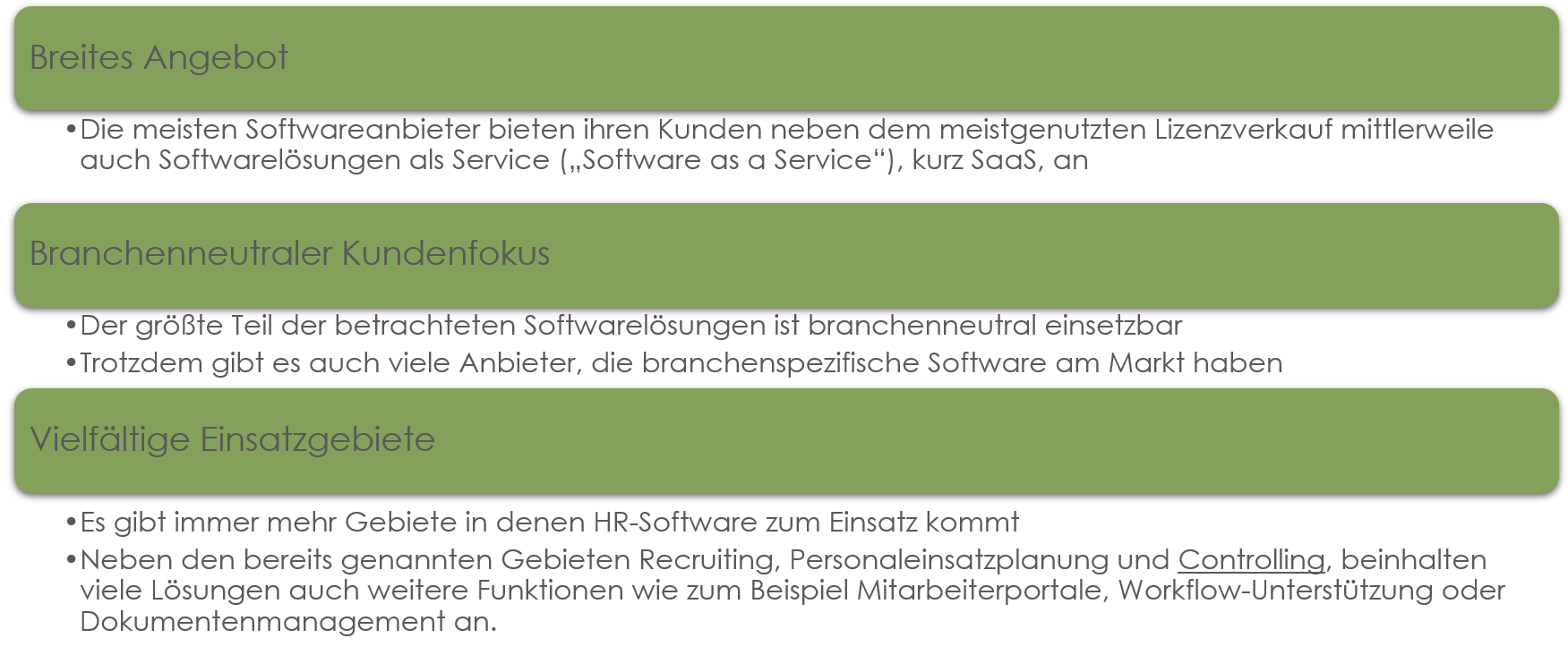 Neben spezialisierten Einzellösungen für zum Beispiel Recruiting, Personaleinsatzplanung oder Controlling, stehen auch Komplettlösungen für den gesamten HR-Prozess - von der Personalbeschaffung bis zur Personaltrennung - zur Verfügung. Trotzdem ist im HR-Bereich das Best-of-Breed-Konzept weit verbreitet. Dieses sagt aus, dass in der Personalwirtschaft individuelle Lösungen für die jeweiligen Teilbereiche einer Komplettlösung stets vorgezogen werden.