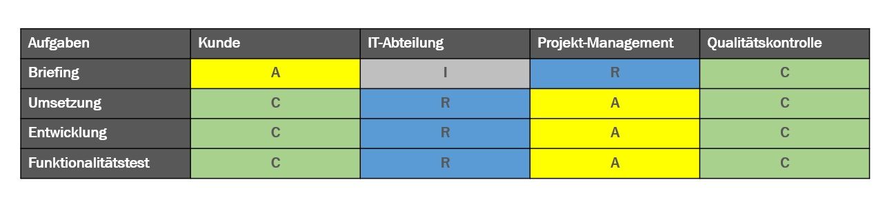 Die Verantwortlichkeiten aller an einem Projekt beteiligten Personen zu klären und transparent zu kommunizieren, stellt eine große Herausforderung dar. Um das Projektmanagement möglichst strukturiert anzugehen, kann als Methode die RACI-Matrix (auch RACI-Diagramm) genutzt werden. RACI ist ein Akronym, was bedeutet, dass der Begriff aus den Anfangsbuchstaben mehrerer Wörter zusammengesetzt ist. Die namensgebenden Attribute der RACI-Matrix sind: