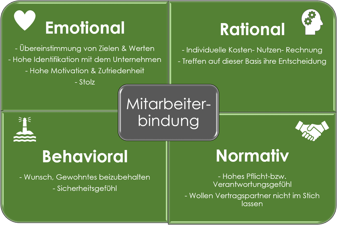 Personalbindung hat eine starke psychologische Komponente. Es werden vier Arten von Mitarbeiterbindung unterschieden: die emotionale, die rationale, die normative und die behaviorale Bindung.