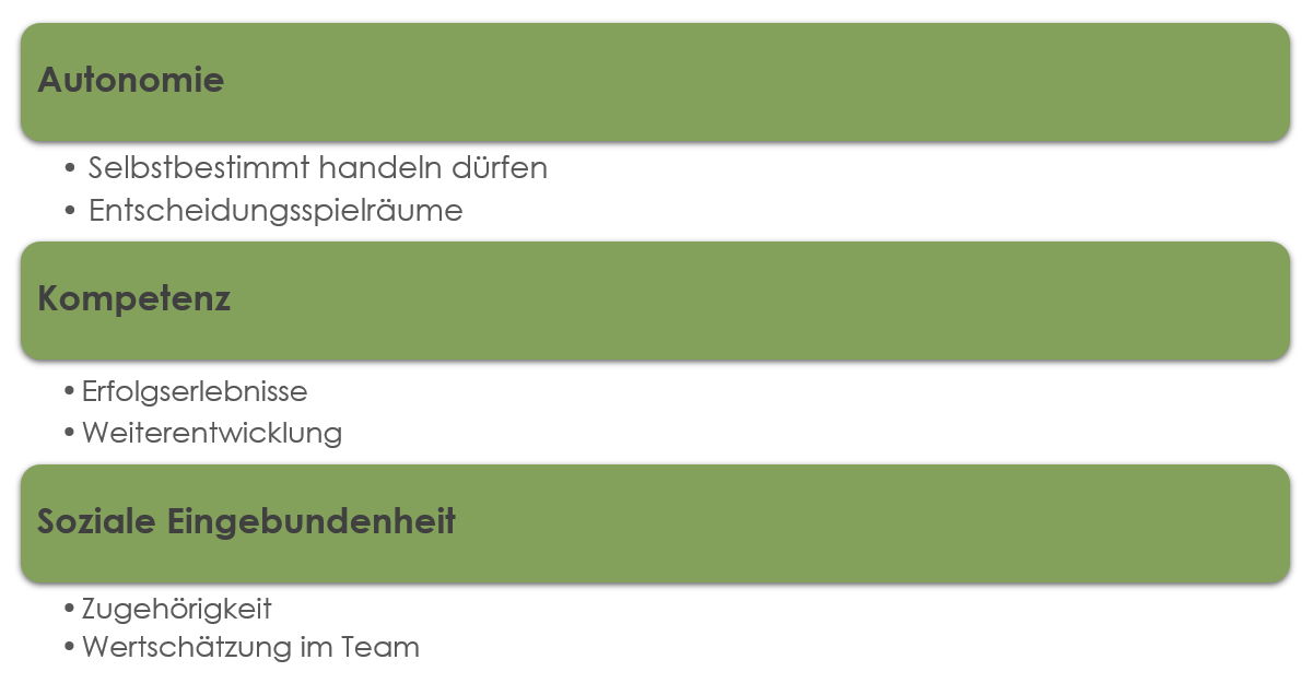 Der Selbstbestimmungstheorie zufolge basieren psychologisches Wohlergehen und intrinsische Motivation auf drei grundlegenden Bedürfnissen. Die Erfüllung dieser Grundbedürfnisse ist somit ein guter Ansatzpunkt in der Gestaltung von Arbeitsbedingungen und Arbeitsaufgaben, die die intrinsische Motivation fördern. Die im Rahmen der Selbstbestimmungstheorie von Deci und Ryan identifizierten Bedürfnisse sind Autonomie, Kompetenz und soziale Eingebundenheit.