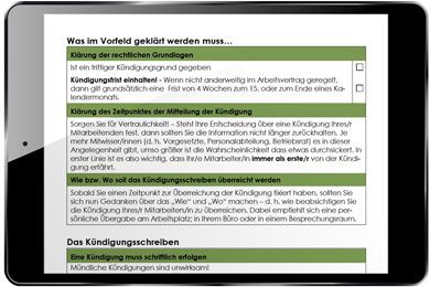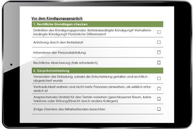 Damit ein Kündigungsgespräch rechtlich korrekt und möglichst wenig unangenehm für beide Gesprächsparteien abläuft, haben wir wesentliche Informationen im Tool „Checkliste Kündigungsgespräche“ zusammengestellt.