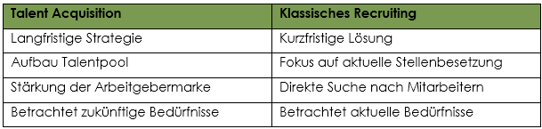 Im Gegensatz zum traditionellen Recruiting, das meist auf eine schnelle Besetzung offener Stellen ausgerichtet ist, fokussiert sich Talent Acquisition auf den nachhaltigen Auf- und Ausbau von Talenten und Potenzialen.