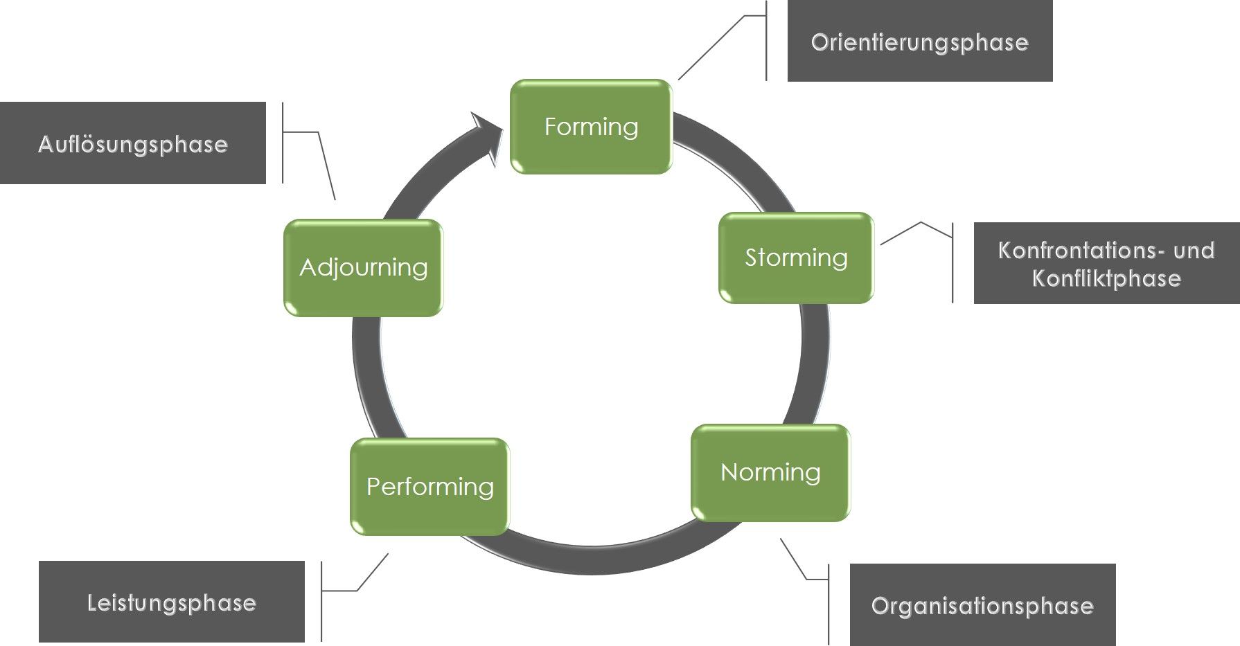Wie eingangs bereits erläutert wird Teambuilding der ersten Phase der Teamuhr von Tuckman zugeordnet. Die restlichen Phasen gehören zum gesamten Entwicklungsprozess des Teams. Doch was bedeutet dies genau?