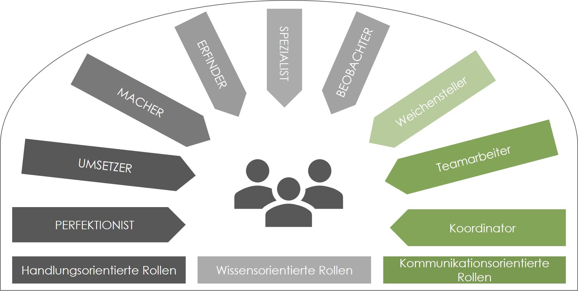 Nach dem britischen Psychologie-Professor Meredith Belbin existieren neun Teamrollen, die in drei Kategorien geclustert sind: handlungs-, kommunikations- oder wissensorientiert. Die Erkenntnis über die verschiedenen Teamrollen hilft der Gruppe die einzelnen Mitglieder zu verstehen. Am effektivsten arbeitet ein Team, wenn jede beschriebene Rolle im Team vertreten ist: