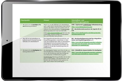 Das Tool „Checkliste für eine inklusive Integration in das Unternehmen" bietet Ihnen einen Überblick über diverse Informationsquellen, die Ihnen bei Fragen rund um das Thema Inklusion am Arbeitsplatz helfen können. Die recherchierten Informationsquellen bieten unter anderem Informationen zu: