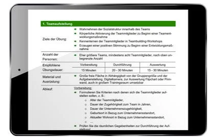 - eine kriteriengeleitete Auswahl zwischen den Teamübungen zu treffen und