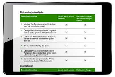 Die "Ideenliste MitarbeiterDEmotivation" besteht aus insgesamt 30 Vorschlägen und ist in folgende sechs Themenblöcke untergliedert: